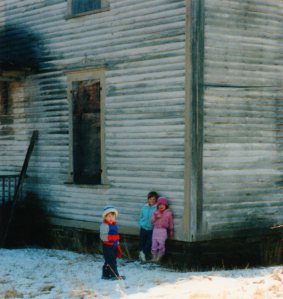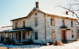 On a frigid, gray late-February day in 1990, the owner of the house agreed to show us the place. Icicles, resembling fangs, hung from the roof. He came with the “key”–a crow-bar to pry the plywood board off one of the entrances. With flash-lights illuminating our way, we entered the cold dark haunted house. Chuck and his dad were giddy with excitement; with each step, I was wondering what all the crunching was about. Bones? Teeth? Walnut shells. For 20+ years, squirrels called this place home and carried in black walnuts from the trees on the property. We proceeded through a maze of rooms. I fully expected a skeleton to jump out at me.