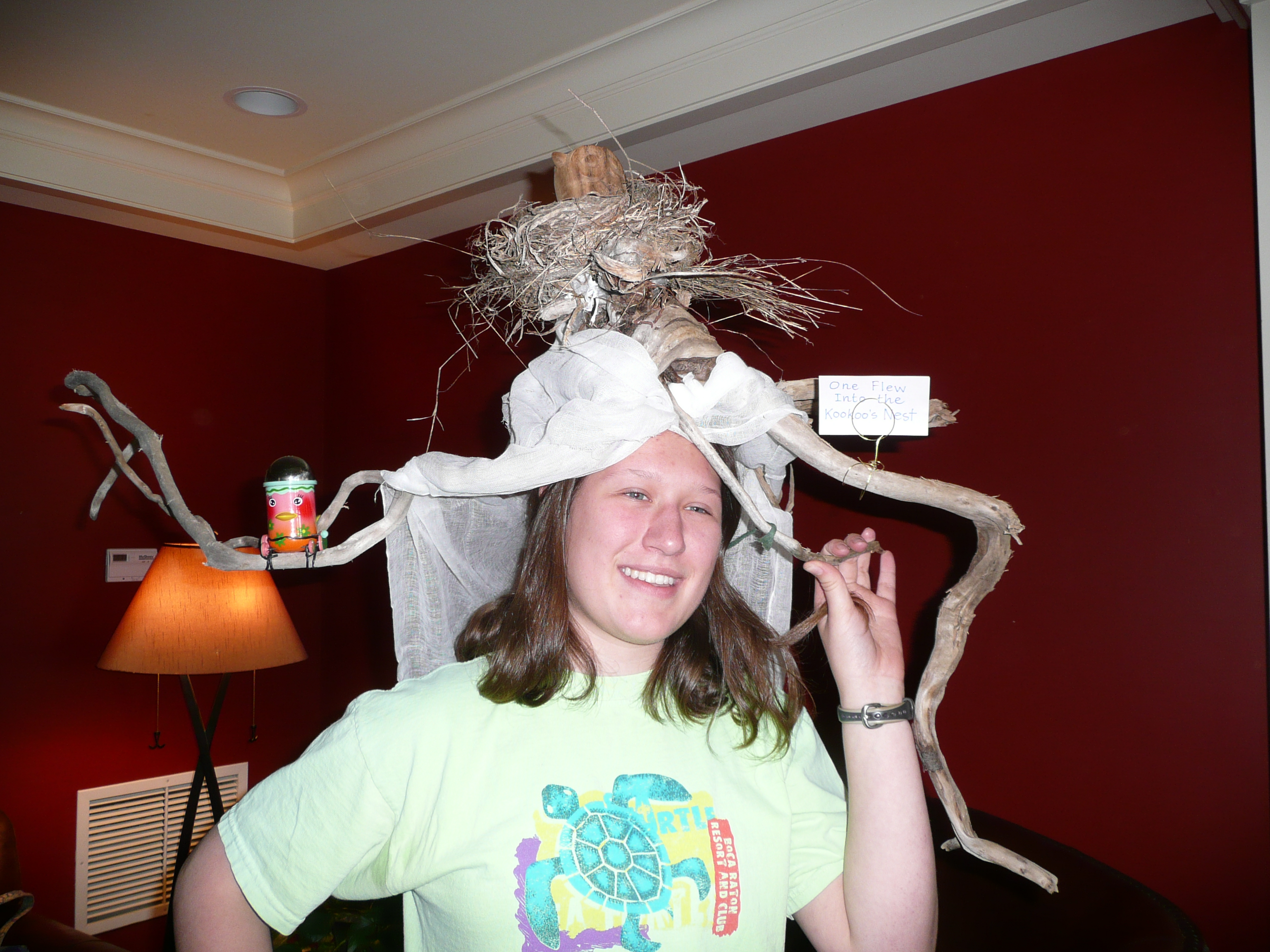 The youngest person at the party and my niece, she named her hat “One Flew INTO the Cuckoo’s Nest.” There is a nest with an owl in it (not real–the owl, that is).