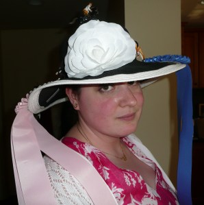My younger sister–the one with all the artistic talent. Remember her? Her “hat” is a headband with a “1st Place” banner stuck to it. She called it “minimalist”; I called it presumptuous. We were both wrong. Spoiler: she didn’t win and some of the women didn’t wear hats–the ultimate in minimalism.