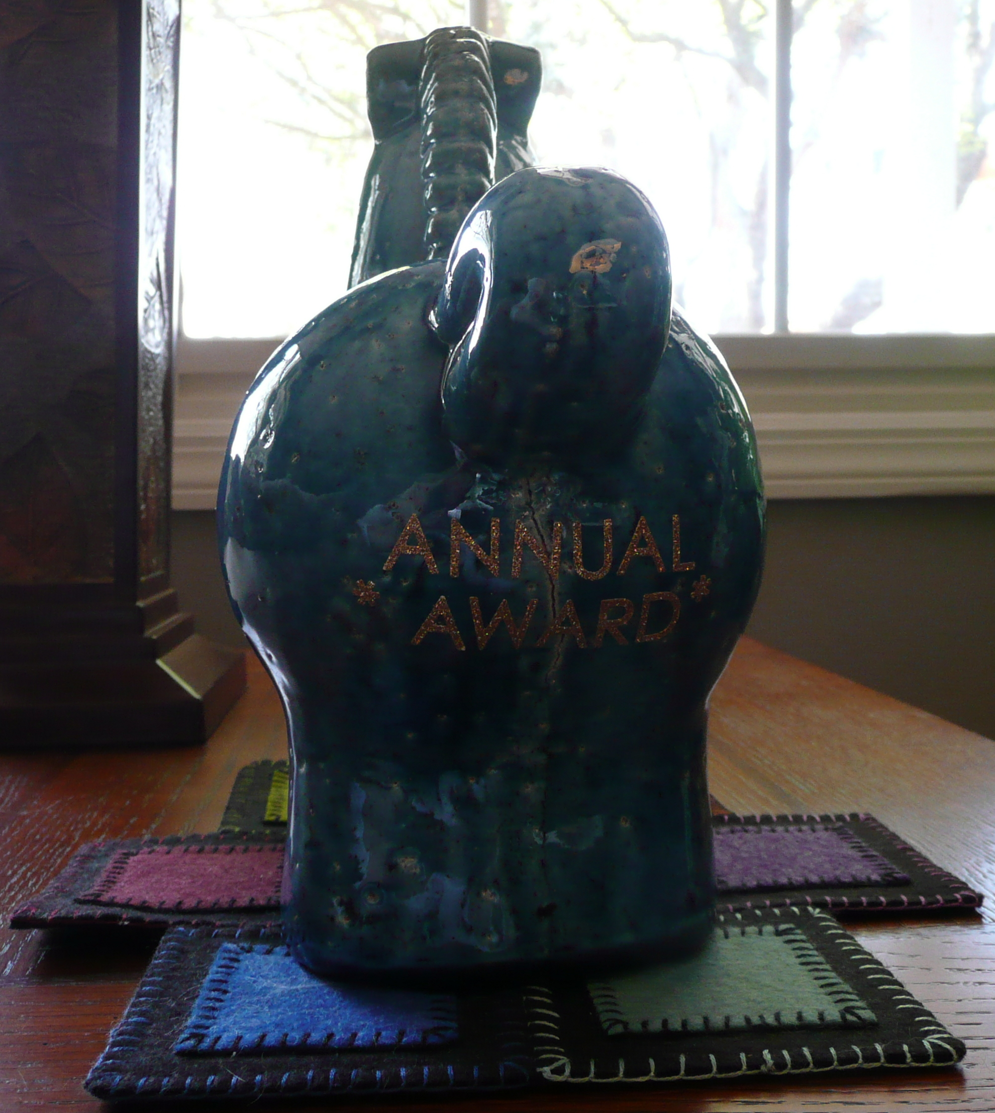 It gets passed around (or that’s the intent) from one year to the next until someone breaks it or loses it–then they have to replace it. Good luck trying to replace that unique trophy! 😉